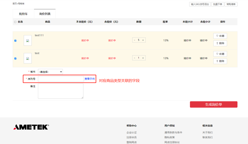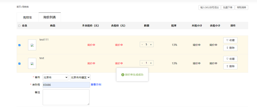1、商品加入询价列表后,商品价格会显示询价中,可以修改商品数量,收藏或者删除商品;