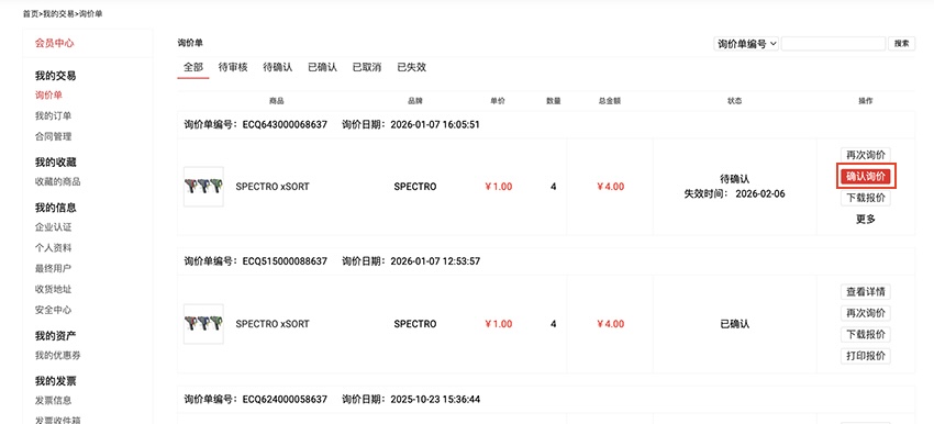 也可以在邮件里点击确认询价进行确认,也可以在后台的我的交易-询价单-待确认中进行询价确认